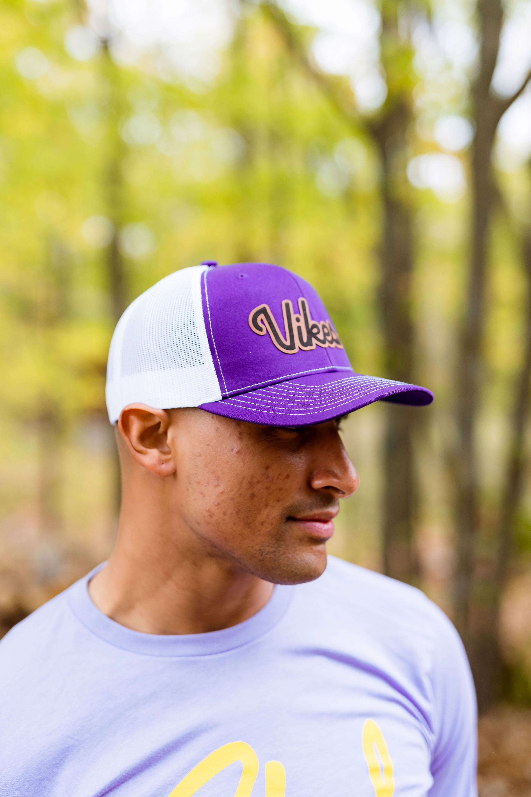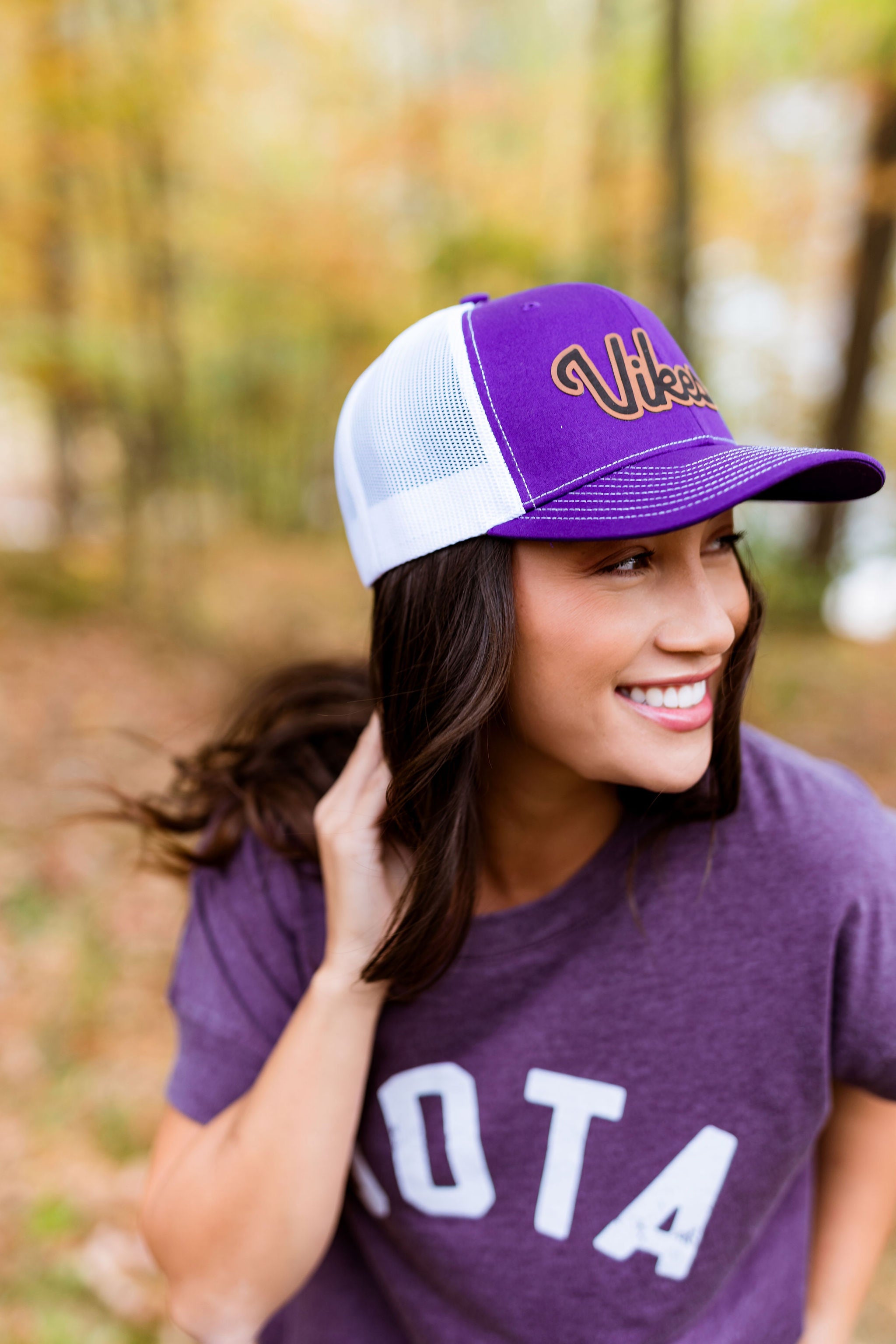 Get ready to show your team spirit with the Vikes Script Snapback! This playful hat features our favorite football team's nickname and bold team colors. Let's Goooooo Minnesota! Purple snapback hat with white mesh and PU leather patch.