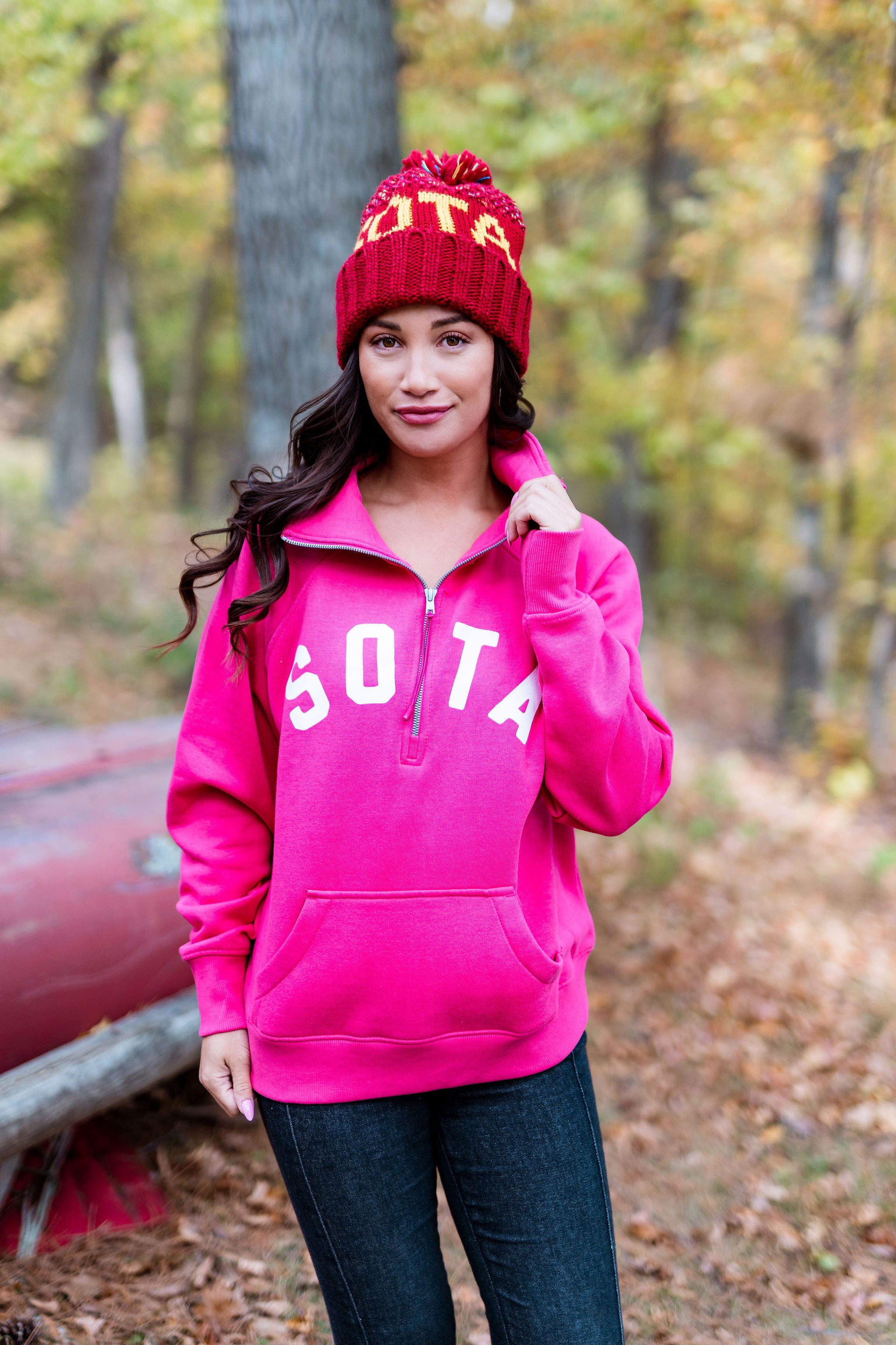 Maroon with a Gold logo, it's topped with a fun knitted pom.